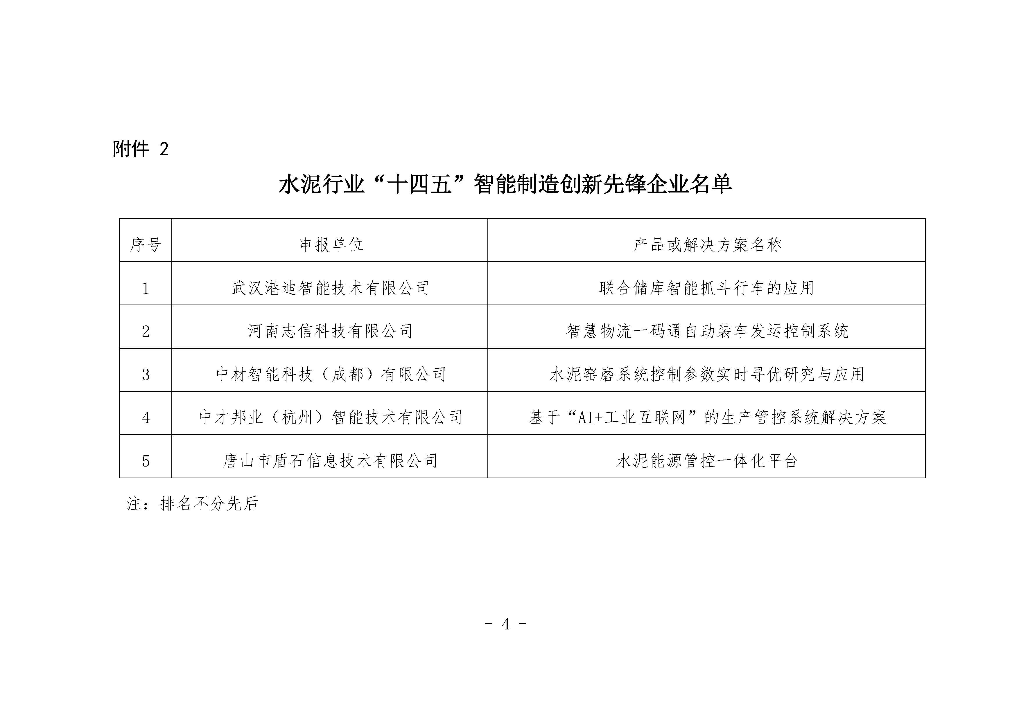 關于公布水泥行業“十四五”智能制造領航企業及創新先鋒企業評選結果的通知